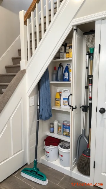 Cleaning tools fit well inside a narrow under stair closet. Brooms, mops, vacuums, and dusters can stand upright without taking over another room.