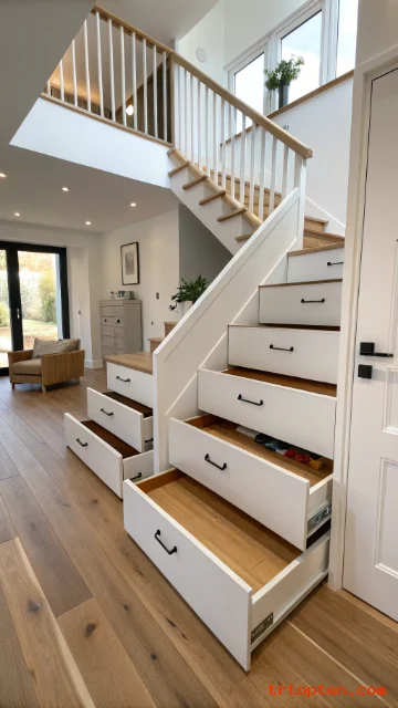 Built-in drawers create a clean look and hide clutter behind smooth fronts. They work well when you want storage that blends into the staircase wall.