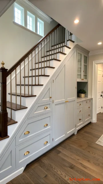 Custom cabinets make under stair storage look polished and built-in. They hide clutter and make the staircase wall feel smooth and intentional.
