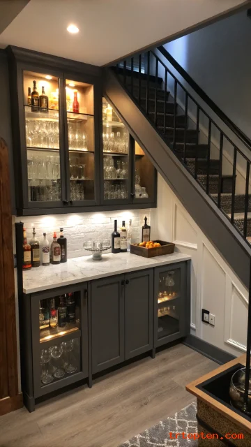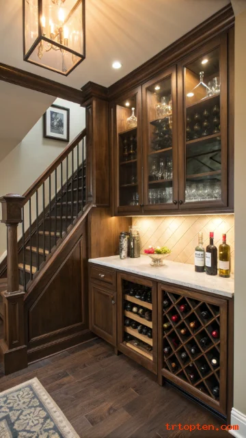 A small home bar can fit under the stairs when you use shelves well. It can store glasses, mixers, bottles, napkins, trays, and serving tools.