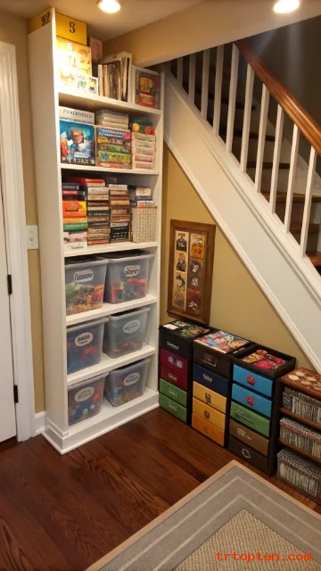 Board games need flat storage and easy access. An under stair closet can hold games, cards, puzzles, and family activity supplies.