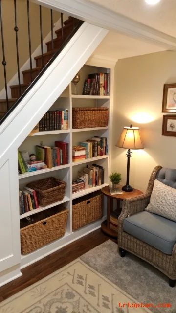 A reading nook under the stairs can include storage without feeling crowded. Built-in shelves and lower drawers can hold books, blankets, and reading supplies.