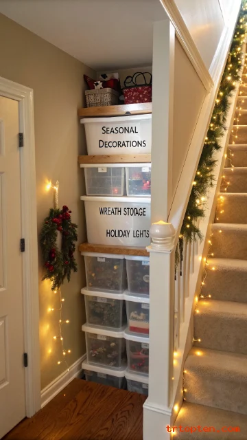 Seasonal decorations often need storage that stays out of sight. The under stair closet can hold holiday boxes, wreaths, lights, and party supplies.