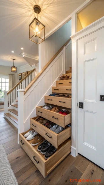 Pull-out shoe drawers make an under stair closet feel neat and easy to manage. You can slide each drawer open and see every pair without bending or digging.