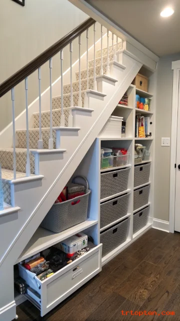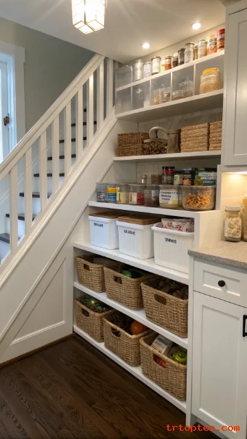 An under stair pantry can store dry food, snacks, cans, and kitchen extras. This idea works well when the staircase sits close to the kitchen or dining room.
