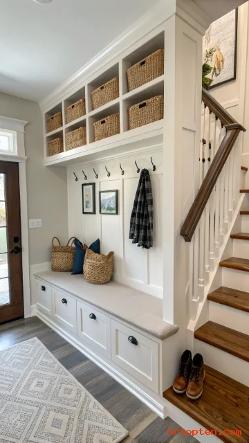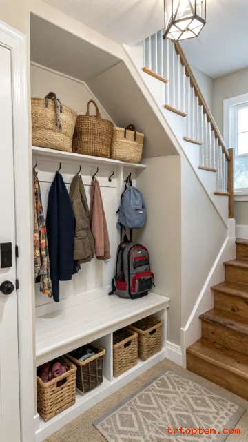A mini mudroom under the stairs gives your home a practical landing spot. It can hold shoes, coats, bags, umbrellas, and everyday outdoor items.