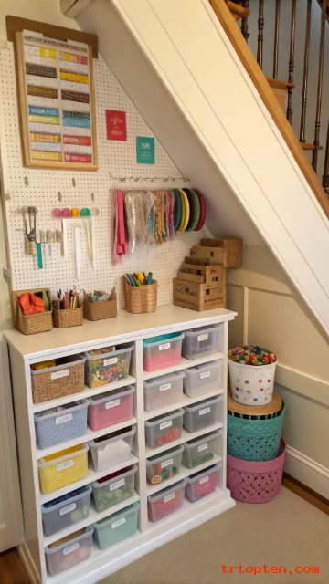 Craft supplies need order because small items can scatter quickly. An under stair closet can store paints, paper, glue, yarn, fabric, and tools.