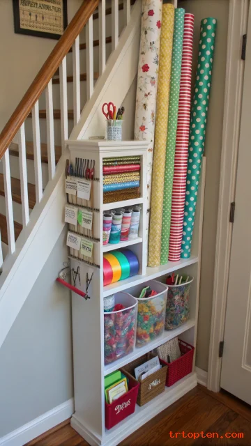 Gift wrap needs long storage, so it often becomes awkward to manage. An under stair closet can hold wrapping paper rolls, ribbons, bags, boxes, and tape.