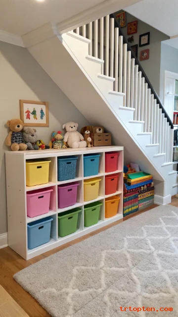 A kids’ toy closet under the stairs can keep play items close but contained. Low shelves and open bins make cleanup easier after playtime.
