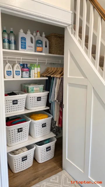 Laundry supplies often crowd the laundry room. An under stair closet can store detergent, dryer sheets, stain removers, baskets, and extra hangers.