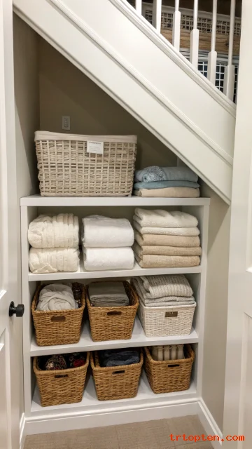An under stair linen closet can hold towels, sheets, blankets, and spare pillows. This idea helps when your home lacks a hallway linen cabinet.