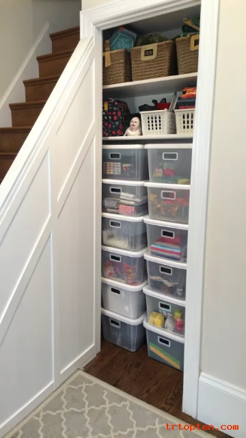 Clear bins make an under stair closet flexible and easy to scan. This idea works when the closet holds many mixed household items.