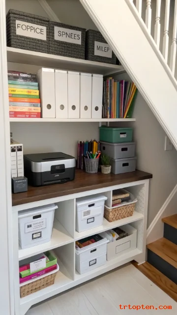 Office supplies can fill drawers and counters when they lack a home. An under stair closet can hold paper, printers, folders, cables, and extra stationery.