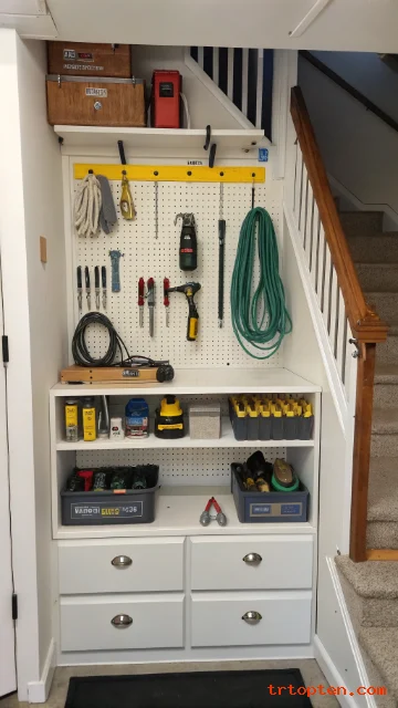 A tool closet under the stairs can keep small home repair items organized. It can hold screwdrivers, hammers, tape, nails, screws, cords, and manuals.