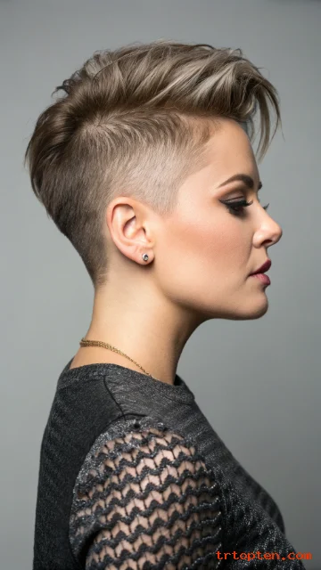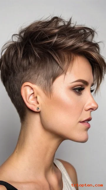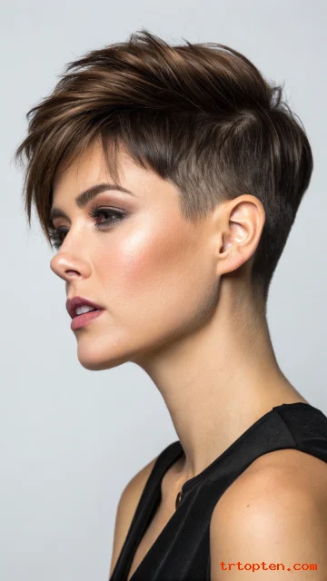 This pixie keeps the sides shaved while the top remains longer and flexible. The shape feels bold and clean with strong contrast.