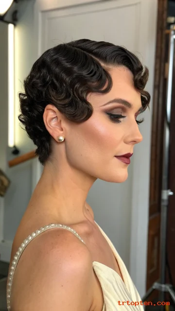 Finger waves turn a pixie into a vintage-inspired statement with smooth S-shaped curves. The look feels glamorous and structured.