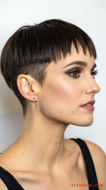 This pixie uses a very short fringe that sits high on the forehead for a sharp, modern finish. The cut keeps the crown neat, so the micro bangs become the main feature.