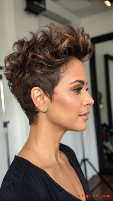 This style works well for women who want a pixie that looks effortless. It suits naturally wavy hair too, with minimal heat.