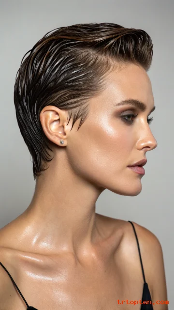 A wet look pixie uses gel to create a sleek, shiny finish that looks runway-ready. The hair sits close to the head with strong definition.