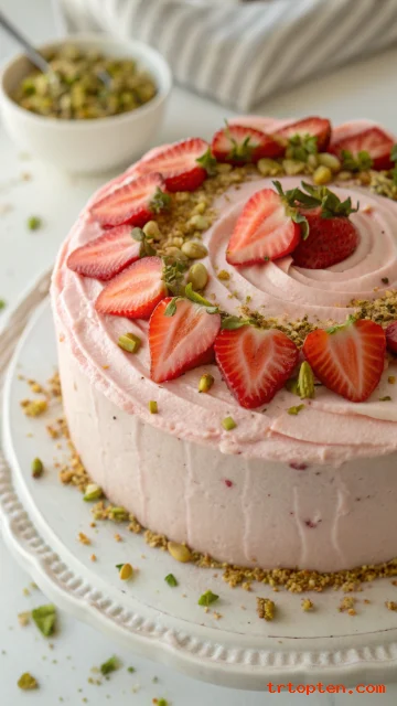 Decorate with sliced strawberries and crushed pistachios for color. Keep the frosting smooth and pale pink.