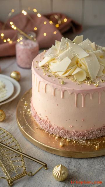 Top with white chocolate shards and edible glitter for sparkle. Keep the palette blush and gold for a party look.