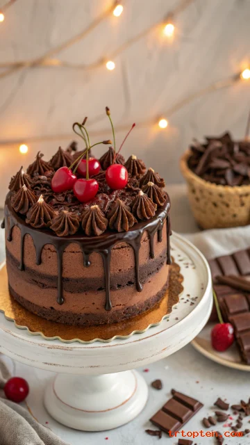 Drizzle ganache and add chocolate curls for a rich finish. Slice it to show the cherry layer clearly.