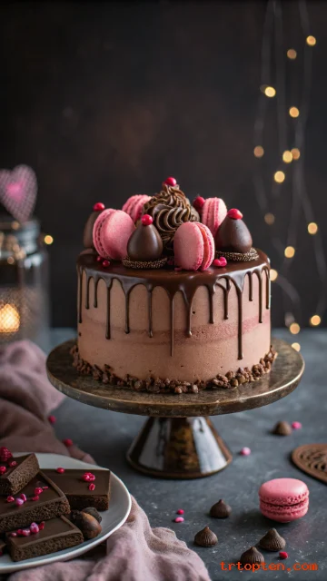 Add chocolate truffles and pink macarons to make the top look full and festive. Keep the sides simple so the drip stays the star.