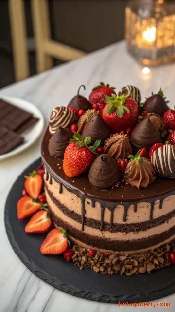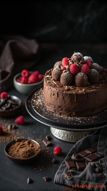 Top with truffles, raspberries, and cocoa dust for drama. Keep the design bold and sleek.