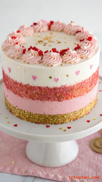 Add extra frosting around the top and bottom edges to frame the center band. Use pink, red, and gold sprinkles for a Valentine feel.