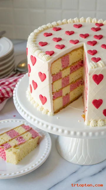 Bake one vanilla batter and one pink-tinted batter, then build a checkerboard pattern. Frost with vanilla buttercream so the inside stays a surprise.