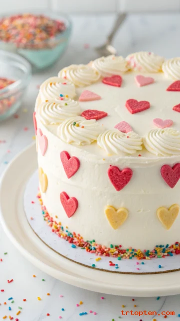 Bake two round vanilla layers and cut them into a heart shape with one clean template. Frost with smooth vanilla buttercream and add tiny sugar pearls for a soft sparkle.