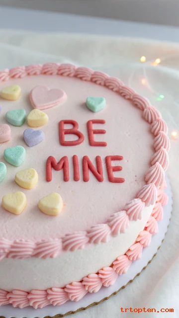 Bake vanilla layers and frost with pastel buttercream in a smooth coat. Use candy hearts on top to spell a short message like “BE MINE.”