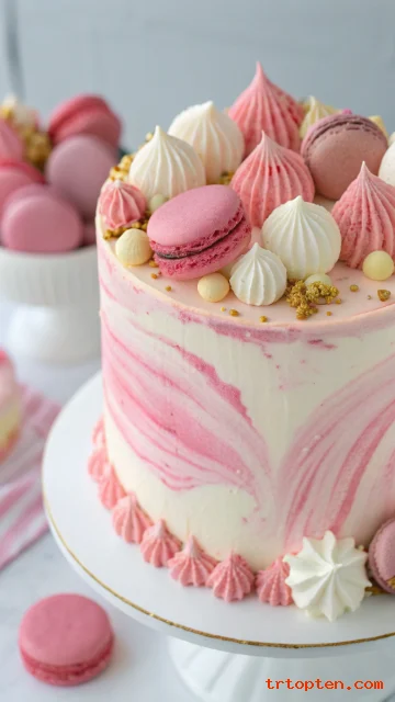 Top with a few macarons and meringue kisses for height. Keep the plate simple so the marbling shows.