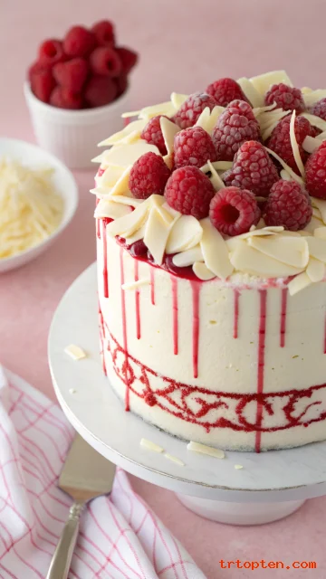 Top with fresh raspberries and white chocolate curls for texture. Add a thin raspberry drizzle for a glossy finish.