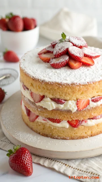 Pile strawberries on top and dust with powdered sugar for a gentle finish. Chill it before serving so the layers stay sharp.