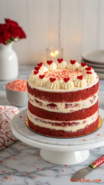 Top with red velvet crumbs and a few heart sprinkles for a fun texture. Slice it on camera to show the deep red interior.
