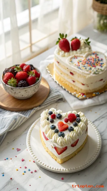 Use pink and red piping to frame the heart and keep the center clean for a neat look. Add fresh strawberries on top so the cake feels bright and fresh.