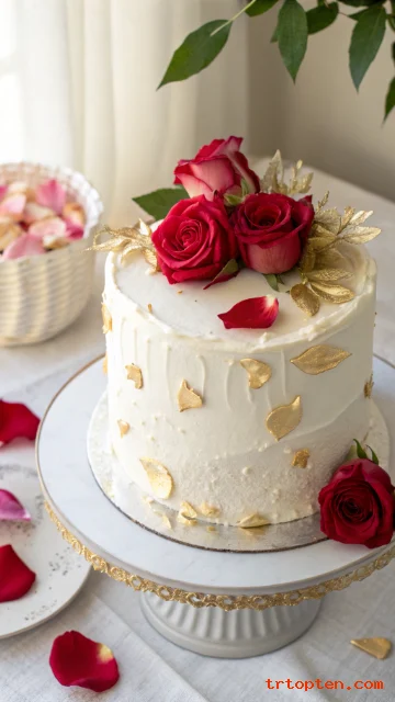Add a thin gold leaf touch for an elegant finish. Use food-safe petals and keep the design simple.