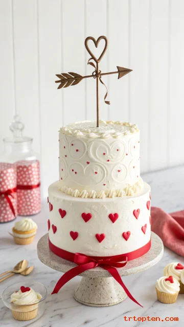 Choose chocolate or vanilla layers and frost the cake in smooth white buttercream. Add a simple fondant or paper cupid arrow topper across the top.