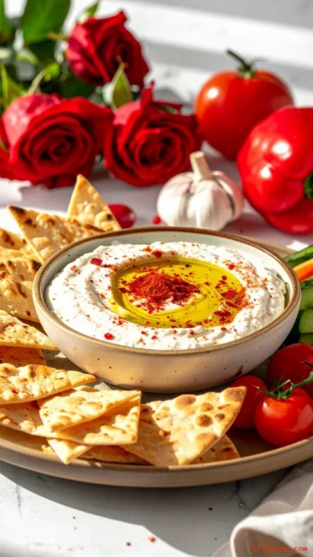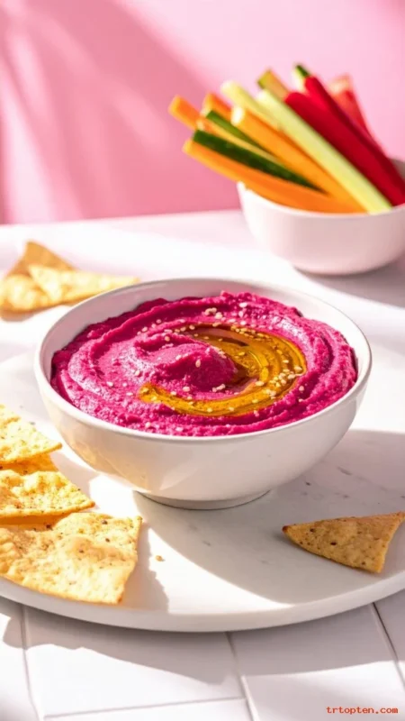Go for creamy dips with bold color like beet hummus or roasted pepper feta dip. Add olive oil drizzle and herbs for a polished look.