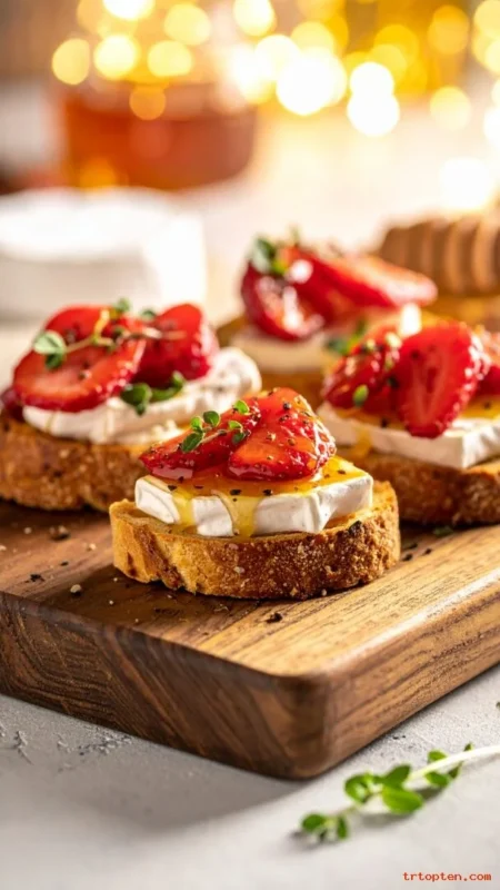 Toast baguette slices until crisp, then spread warm brie on each piece. Top with sliced strawberries and a small spoon of honey.