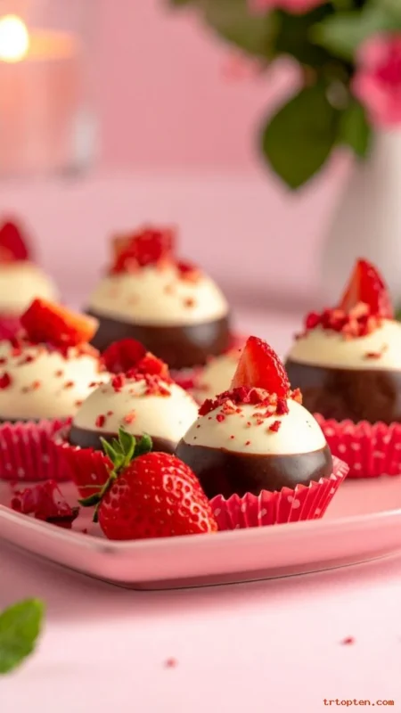 Mix cream cheese with crushed cookies and shape into small balls. Dip them in chocolate and top with crushed freeze-dried strawberries.