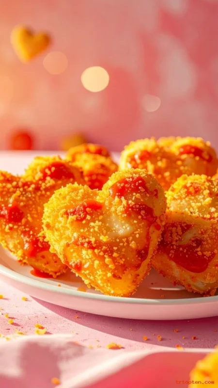 Cut mozzarella sticks in half and bend them into heart shapes. Freeze briefly, then bread and fry or bake.
