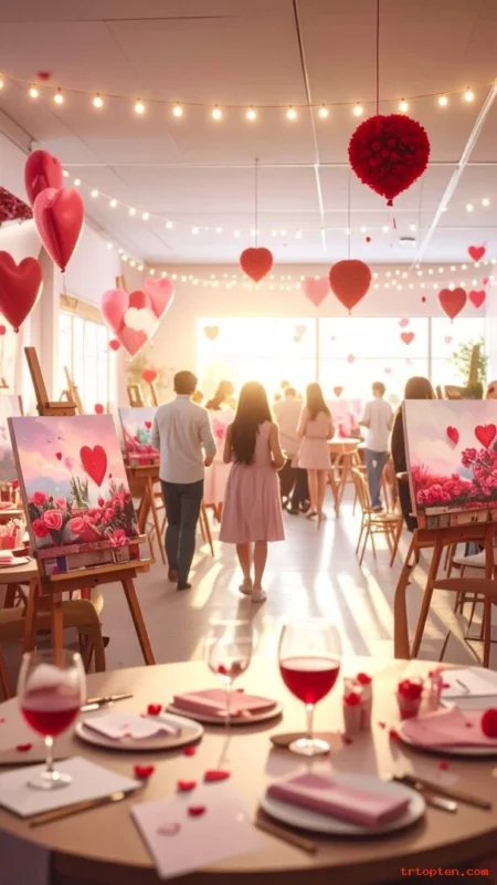 Set up canvases, brushes, and a guided painting theme like sunsets or floral hearts. Keep the lesson simple so beginners feel relaxed. Offer a drink ticket and easy snacks to keep energy up.