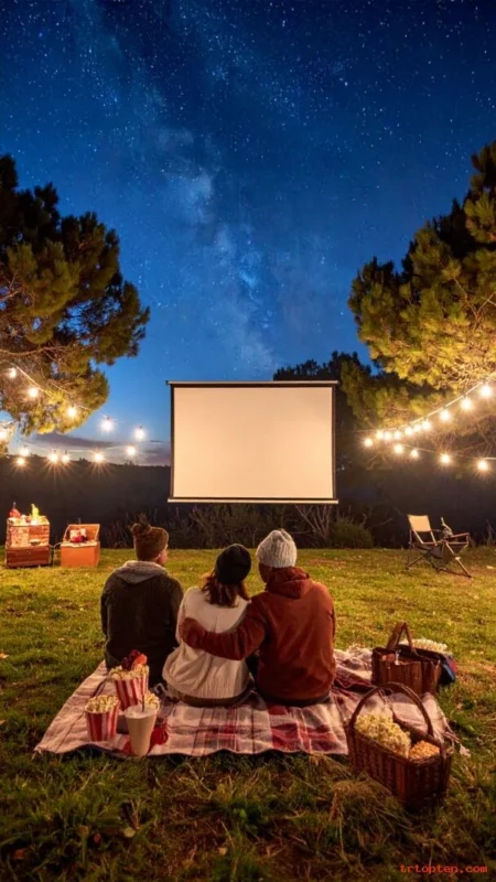 Create a “build your own s’mores” station and a hot drink corner. Add subtle lighting along walkways for safety and comfort. Give guests a printed schedule so they know when the film starts.