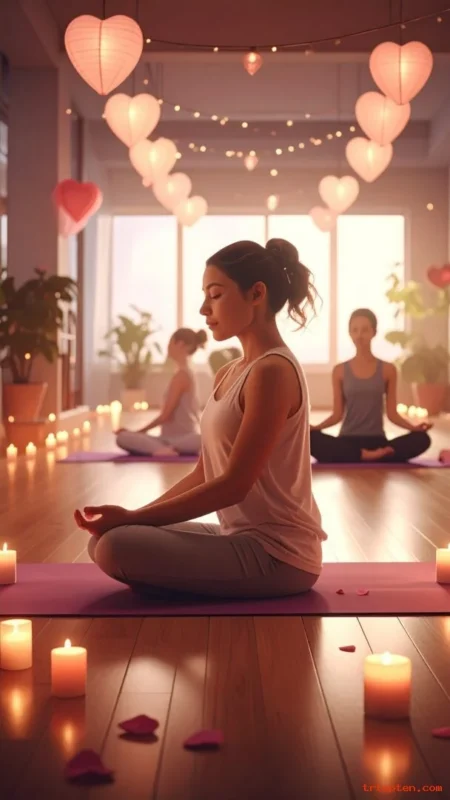 Image prompt: Wide view of a yoga studio with couples doing gentle partner poses, candles or soft lamps, heart-themed subtle decor, calm atmosphere, high-resolution realistic wide shot.