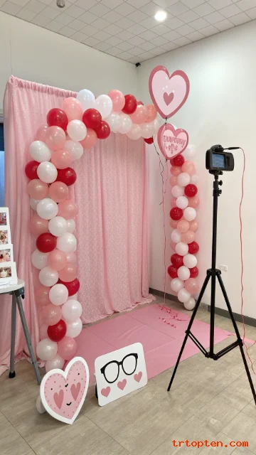 Use a heart balloon arch or a fabric backdrop in pink tones. Add props like heart glasses and speech bubbles. Place a tripod and phone remote for easy shots. Keep good lighting so photos look clear.