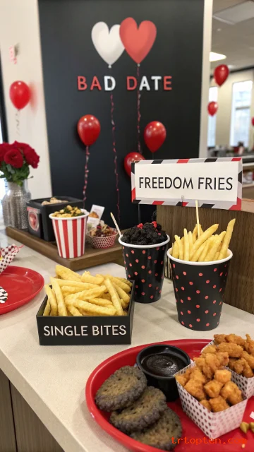 Use black and red decor with funny signs and “bad date” stories. Serve snacks with playful names like “freedom fries” and “single bites.” Set a respectful rule to avoid naming real people. Keep games focused on jokes, not drama.