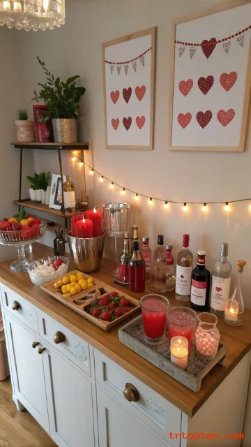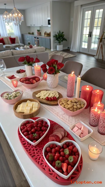Use heart-shaped bowls for olives, nuts, and dips. Add berries, cheeses, crackers, and chocolates in red and pink tones. Label items for allergies and dietary needs. Refill small boards instead of piling everything at once.
