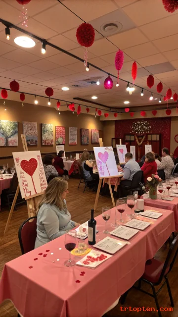 Set up canvases, brushes, and a simple heart or rose design. Offer wine, mocktails, and water at the table. Play music and guide steps in short rounds. Keep aprons or old shirts available.